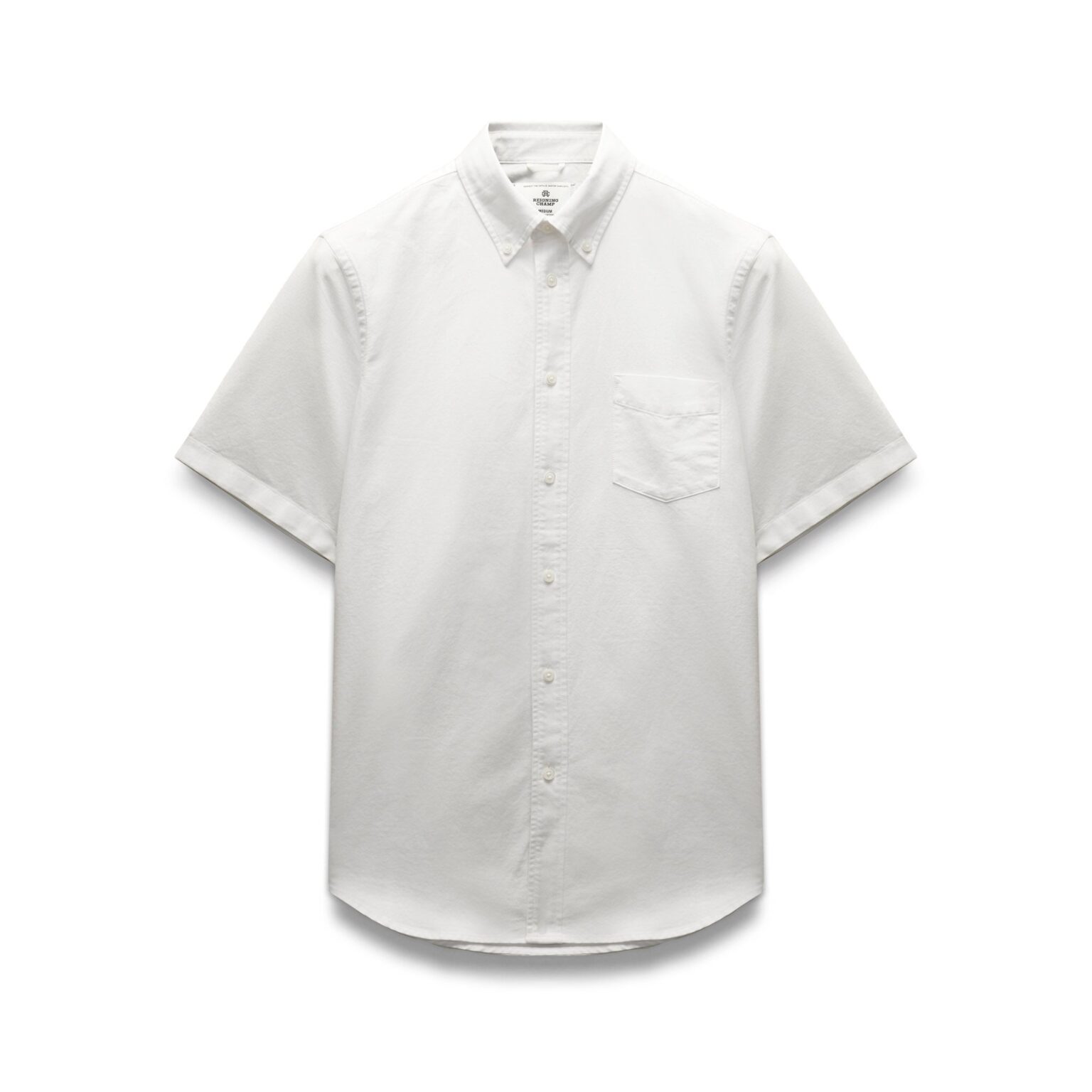 This buttondown short sleeve shirt is crafted from classic cotton oxford in a year-round weight. Featuring a standard fit, with full cut sleeves and torso. Designed with faux horn buttons, a chest pocket, and a curved hem. Finished with tonal monogram embroidery on the left sleeve cuff.