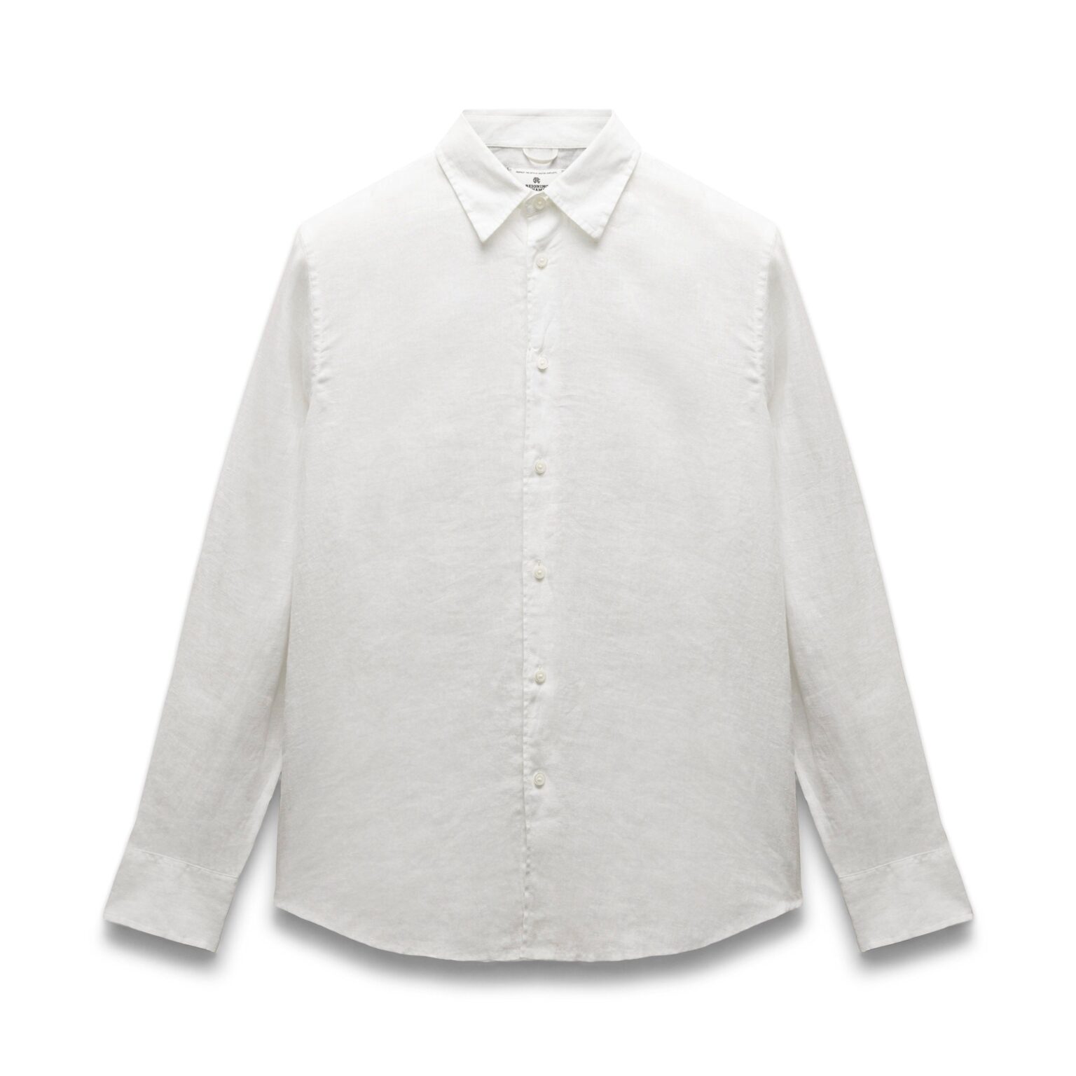 This summer long sleeve button-up shirt is crafted from airy, lightweight linen with a naturally textured hand. Featuring a standard fit, with full cut sleeves and torso. Designed with clean french seams, a pointed collar, faux shell buttons, a curved hem, and side gussets for a tailored drape.
